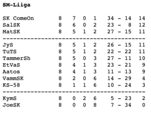 Shakkikerho ComeOn voitti viikonloppuna pelatussa liigassa molemmat ottelunsa ja säilytti kärkipaikan SM-liigassa. Myös tuplavoittoon yltänyt Salon Shakkikerho nousi toiseksi, ja Matinkylän Shakkikerho putosi kolmanneksi hävittyään sunnuntaina ComeOnille.