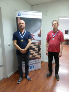 Yhteensä lähemmäs 6000 selopeliä pelanneet Esa Auvinen ja Petri Saharinen. Auvinen onnistui lopulta voittamaan vaikean loppupelin päätteeksi.