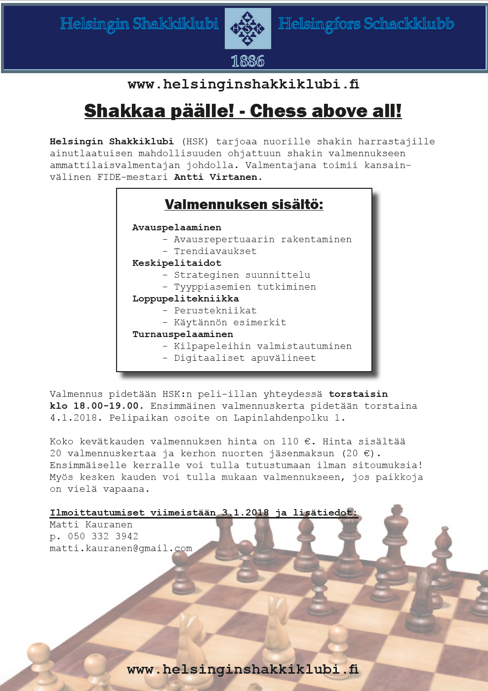 Helsinki Chess Club is hosting unique chess training possibility for young chess players with professional chess coach and FIDE-master Antti Virtanen.